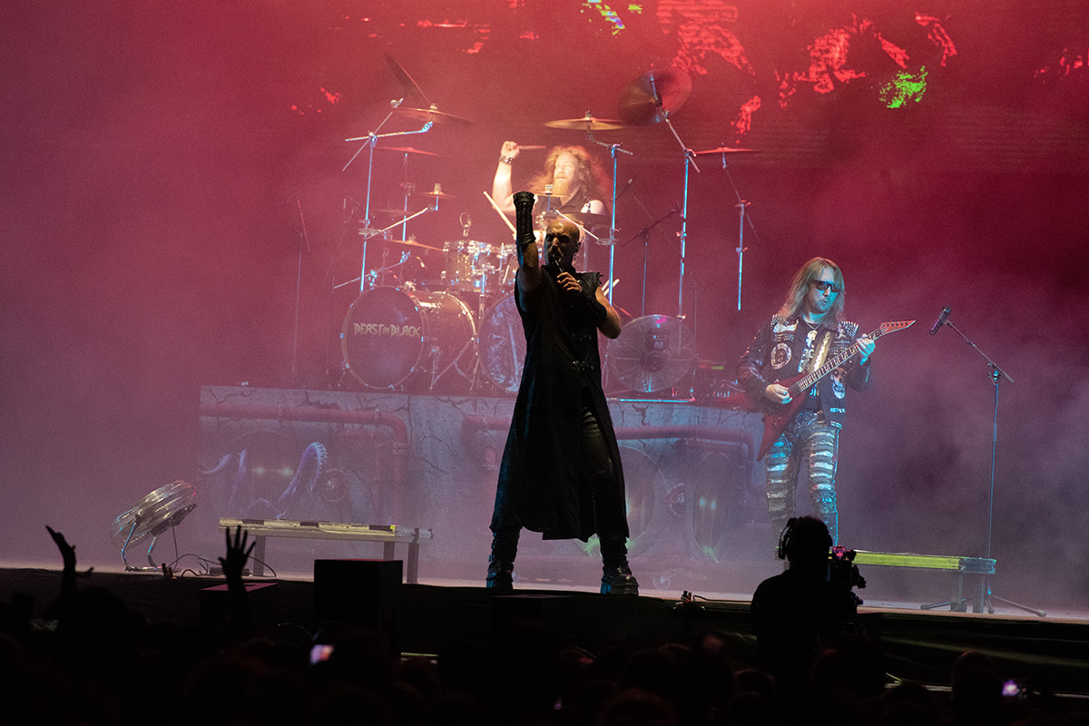 Si Powerwolf te aplasta con escenografía, Beast in Black te gana por perseverancia melódica y dinámica: estribillo, subida, otra subida, coreo… y así hasta que te rindes. Venían calentando el ambiente desde días antes (“Beasts of Spain, are you ready?!”), y el sábado lo confirmaron con creces.